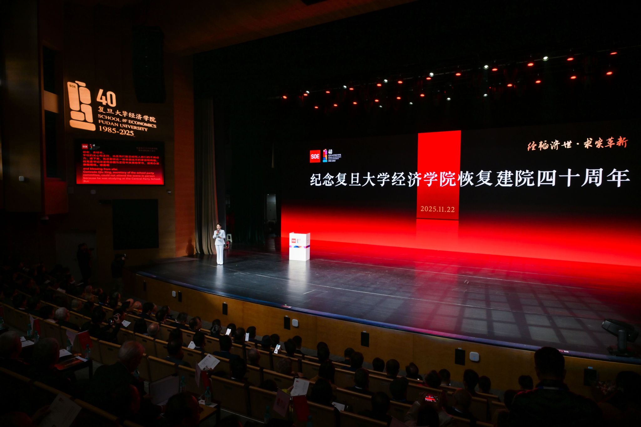 四十载风雨兼程,与时代同频共振;四十载春华秋实,为强国建设赋能。当中国经济迈向高质量发展的崭新征程,中国经济学教育与研究也迎来继往开来的关键节点。2025年11月22日,以“经韬济世·求实革新”为主题的复旦大学经济学院恢复建院四十周年纪念大会在复旦大学相辉堂北堂举行。
